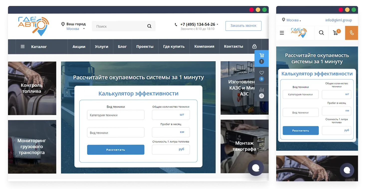 Компания "Где Авто" предлагает своим клиентам полный цикл реализации коммерческих и государственных проектов для внутреннего контроля и учета. Осуществляет поставку и монтаж систем мониторинга транспорта, контроля топлива, а также установку тахографов, изготовление карт водителя, переоборудование транспортных средств и т.д. Собственный магазин оборудования и лицензированный сервисный центр позволяет комплексно подходить к решению каждой поставленной задачи.
